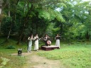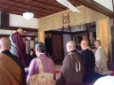| 当淺井歴史民俗資料館から北へ4キロの所に、「近江孤篷庵」があります。ここは、京都孤篷庵と同じく京都大徳寺派に属する臨済宗の寺です。 小堀遠州並びに小堀家歴代の菩提寺として知られ、本堂の南面は広々とした枯山水庭園、東北面は池泉回遊式庭園で、春はつつじ、秋は紅白のはぎ、紅葉など四季折々の趣ある風情で多くの観光客を招じ入れています。 昨年は、参道を、京都高台寺、建仁寺、大徳寺庭園修復、愛知万博庭園石組み担当で有名な北山安夫氏の指揮により、地元保存会などのボランティアで、三和土道に改修したところです。(北山氏は、NHKプロフェッショナル仕事の流儀に出演) 今年度は、山門建設と山門周辺庭園整備が、やはり北山安夫氏の北山造園の監修で行われその竣工法要が昨6月9日執行されました。 この、小堀遠州は、知る人ぞ知る、知らない人も知る、千利休と並ぶ三大茶人、多芸多才特に造園、築城に優れ、大徳寺孤篷庵や桂離宮などを手がけました。 遠州の父親、小堀正次は浅井家の家臣でしたが、後秀吉に取り立てられ、秀長に仕え、秀吉没後は正次、政一(遠州)は家康に仕え・・・・・と、めまぐるしく転進し、関ヶ原の戦いの功により備中松山城を賜ります。父の死後、政一が継ぎ、1608年駿府城普請奉行の功により遠江守に叙され、遠州と名乗ることになります。1619年ここ小室藩にやってきます。 遠州は、茶人として徳川秀忠、家光2代にわたって茶道師範をつとめます。 ならば、秀忠夫人の「江」も、当然乍ら江戸城で小堀遠州から茶道の手ほどきを受けたのではないかと思われます。 時間的にも、「江」江戸城在住中に、遠州は何度か、江戸城に出仕しているそうです。姉さん女房の「江」が、秀忠のスケジュール管理をしていて、「遠州さんにお茶を習うの?あの人のお父さん私の父の家来だったのよ。私にも逢わせて!」なんてことになって、出会っていることも考えられそうです。年齢も七つ違いで、話も合いそうですし・・・・・。 竣工法要の後は、翠したたるお庭を舞台に三姉妹ならぬ女性4人のフルート演奏会が持たれ、江と遠州の出会いに夢をはせながら名演奏の数々に酔いしれた次第です。 |