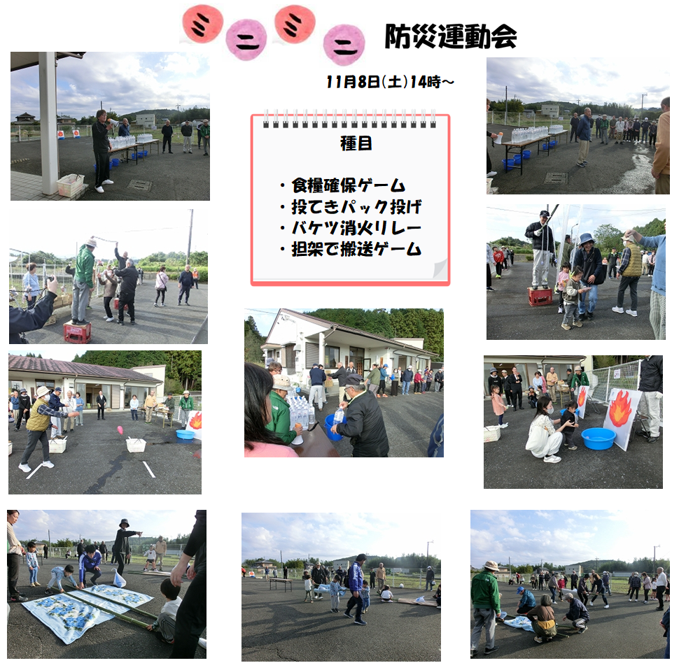 11月8日(土)、午後からミニミニ防災運動会を開催しました。先月の運動会が予備日も含めて中止となり、せっかく購入した競技景品もあったことから、計画をしました。先月末には敬老会、そして今月には球技大会、今月末には文化・農芸祭、さらにその前には地域内の自治会行事でセンターの利用も決まっており、日程の取れない状況でした。ですので、午前には球技大会が予定されていたものの、この日しかない!ということで午後から開催になりました。