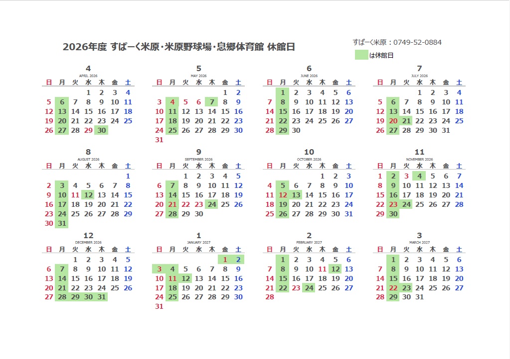休館日2026年度(2026年4月~2027年3月)