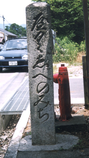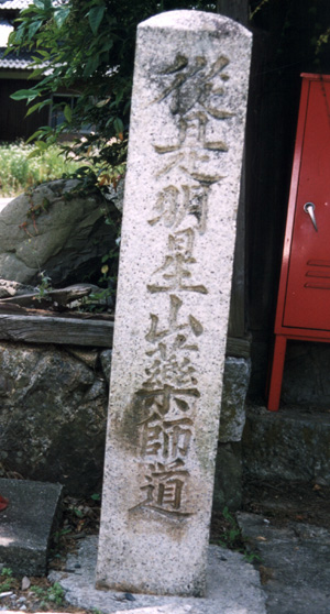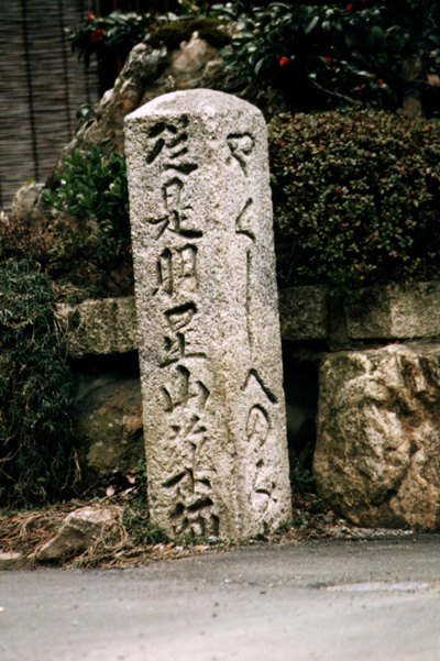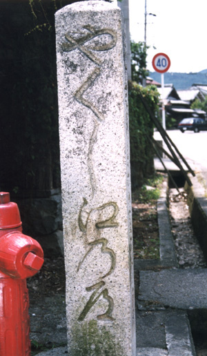 | 柏原宿の道標は多くはありません。その中でも見落とせないのは、「明星輪寺泉明院」への道案内のものです。同じものが約1km離れて2ヶ所に建てられています。正面が漢字で書かれ、左右の面はひらかなを使った二通りの書き方をして、できるだけだれでも読めるように工夫しています。なかなか親切な道標です。裏の面には作った年月日と願主名が書かれています。 |